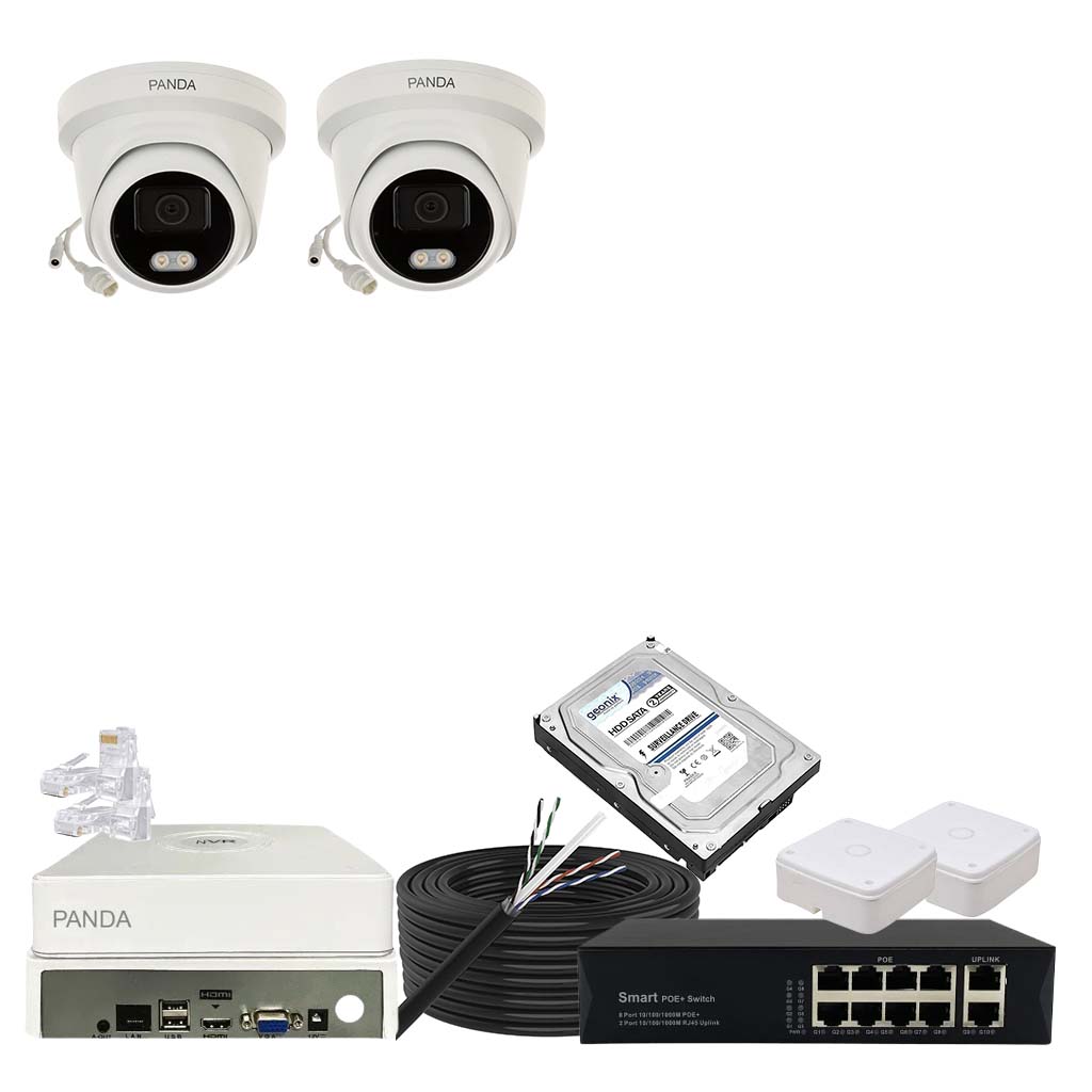 Panda Blue Series IP CCTV kit with 1 dome and 1 bullet 4MP IP cameras featuring color night vision and built-in audio. Includes 8-channel NVR, 4 PoE + 2 Uplink PoE configuration and 500GB HDD.