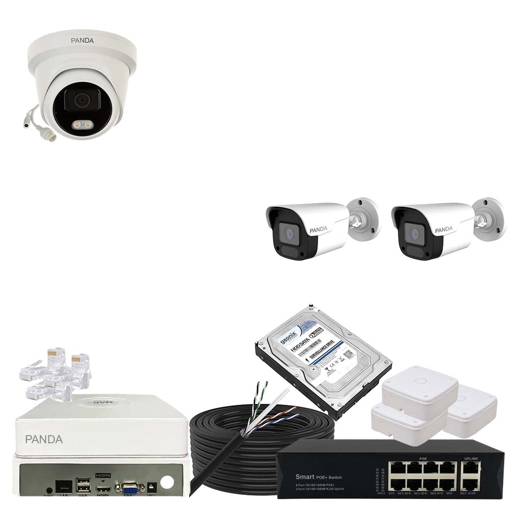 Panda Blue Series IP CCTV kit with 1 dome and 2 bullet 4MP IP cameras featuring color night vision and built-in audio. Includes 8-channel NVR, 8 PoE + 2 Uplink PoE configuration and 1TB HDD.