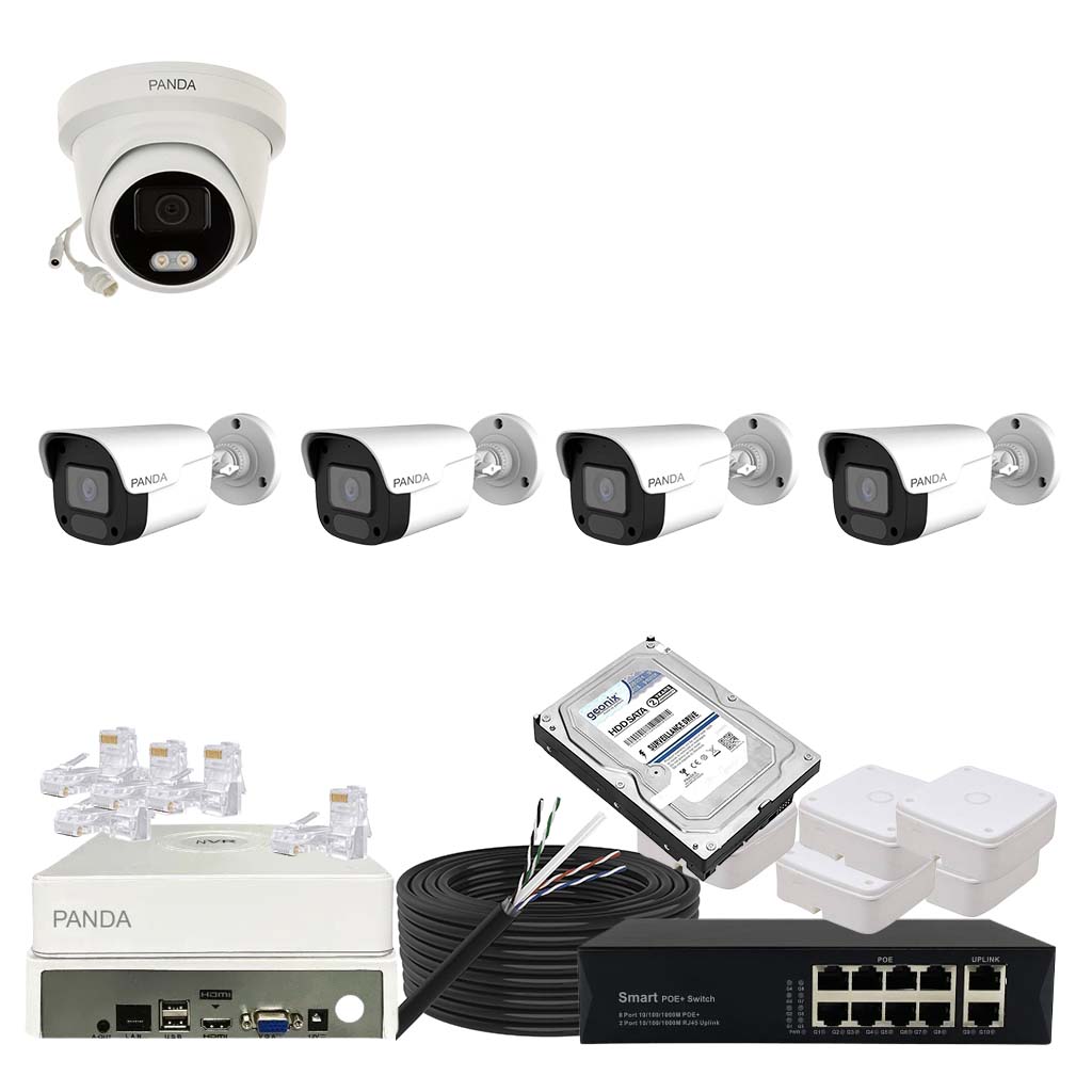 Panda Blue Series IP CCTV kit with 1 dome and 4 bullet 4MP IP cameras featuring color night vision and built-in audio. Includes 8-channel NVR, 8 PoE + 2 Uplink PoE configuration and 500GB HDD.