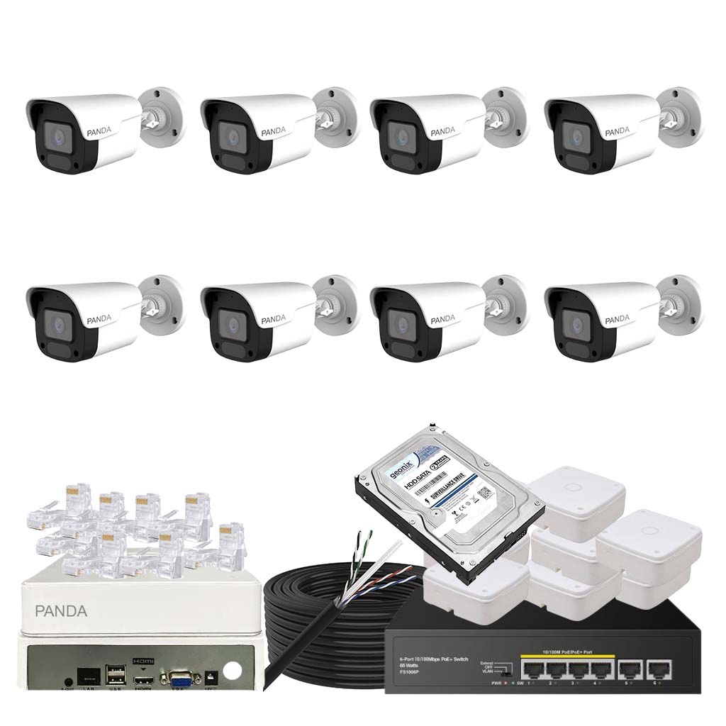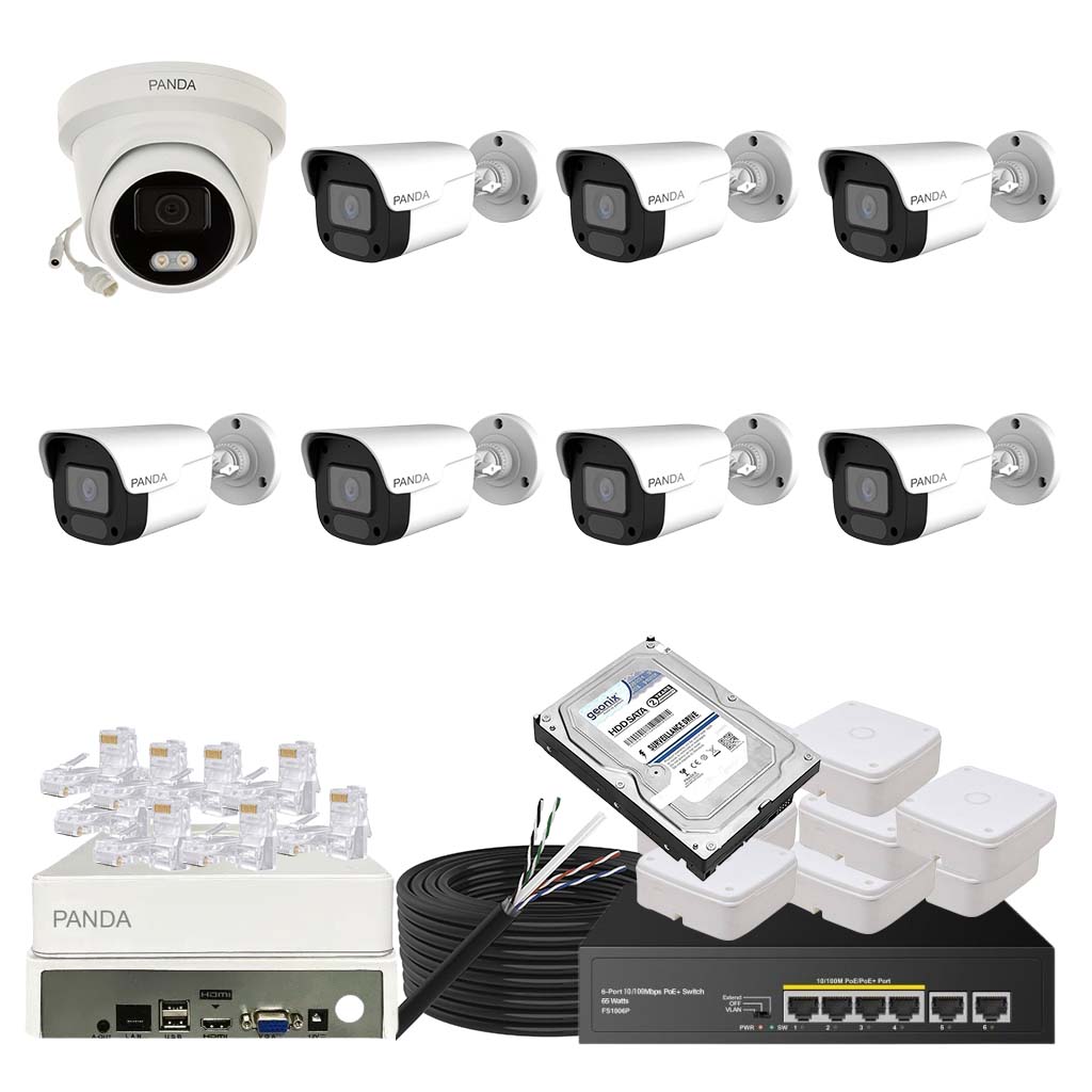 Panda Blue Series IP CCTV kit with 1 dome and 7 bullet 4MP IP cameras featuring color night vision and built-in audio. Includes 8-channel NVR, 4 PoE + 2 Uplink PoE configuration and 500GB HDD.