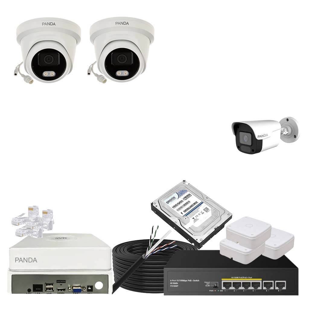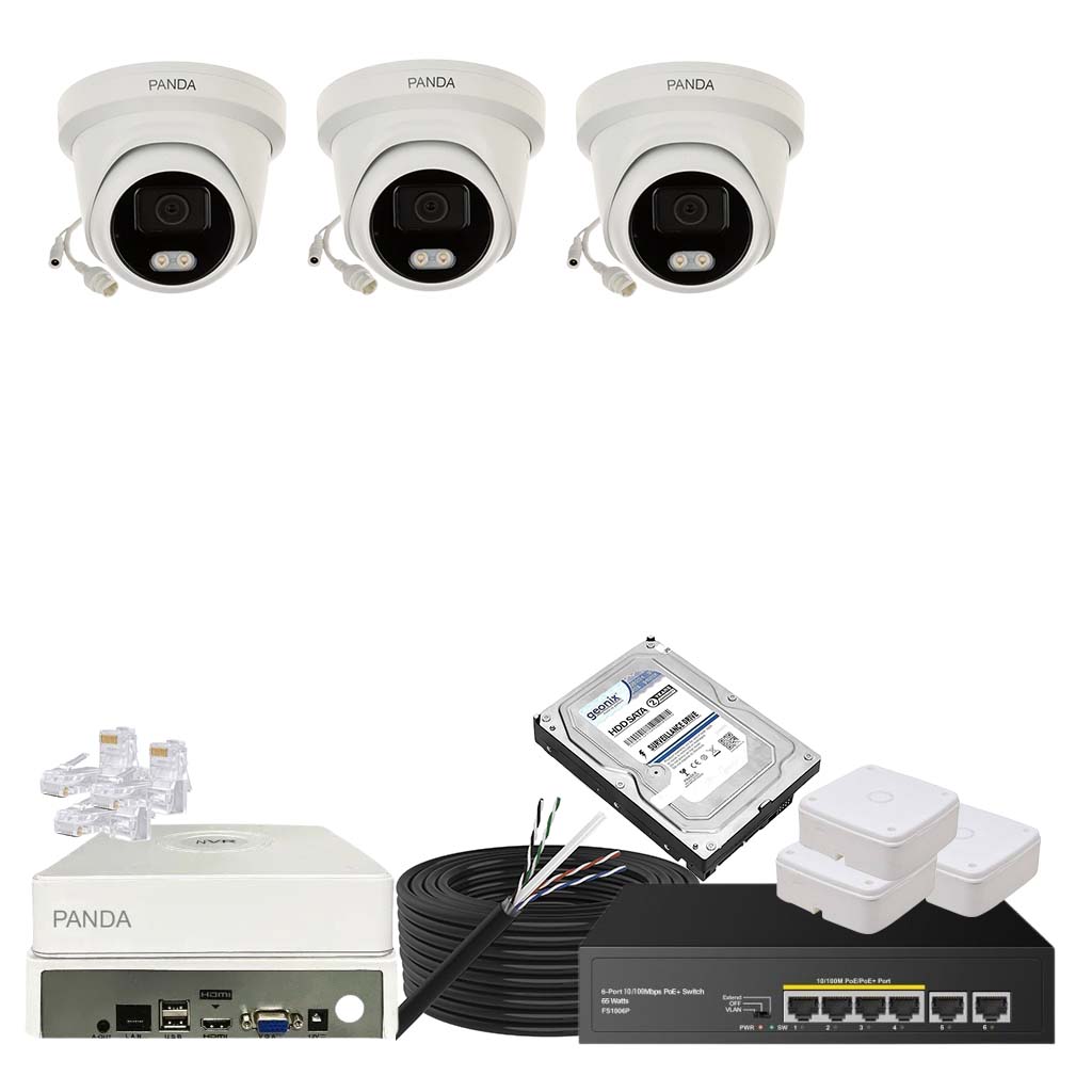 Panda Blue Series IP CCTV kit with 2 dome and 1 bullet 4MP IP cameras featuring color night vision and built-in audio. Includes 8-channel NVR, 8 PoE + 2 Uplink PoE configuration and 1TB HDD.