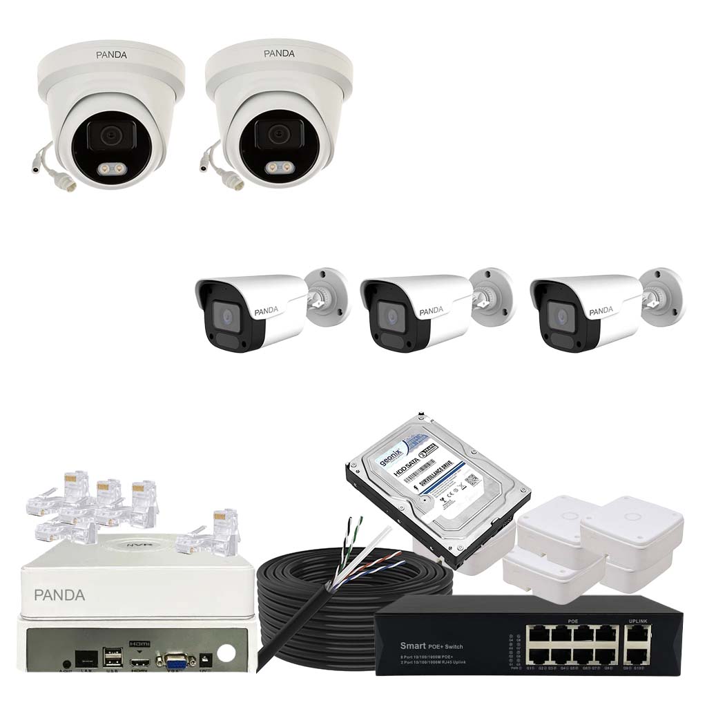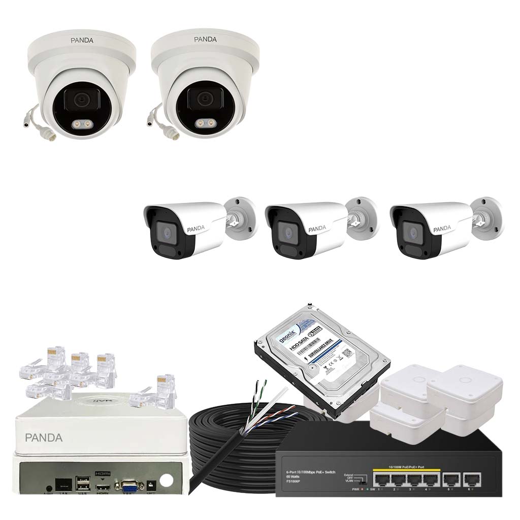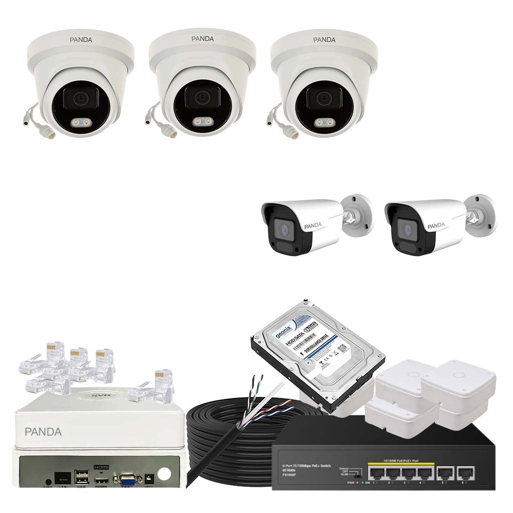 Panda Blue Series IP CCTV kit with 2 dome and 3 bullet 4MP IP cameras featuring color night vision and built-in audio. Includes 8-channel NVR, 4 PoE + 2 Uplink PoE configuration and 500GB HDD.