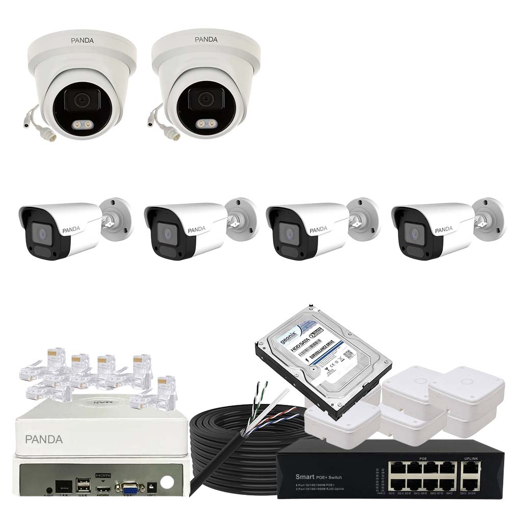 Panda Blue Series IP CCTV kit with 2 dome and 4 bullet 4MP IP cameras featuring color night vision and built-in audio. Includes 8-channel NVR, 4 PoE + 2 Uplink PoE configuration and 1TB HDD.