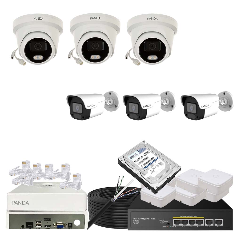 Panda Blue Series IP CCTV kit with 2 dome and 4 bullet 4MP IP cameras featuring color night vision and built-in audio. Includes 8-channel NVR, 4 PoE + 2 Uplink PoE configuration and 500GB HDD.