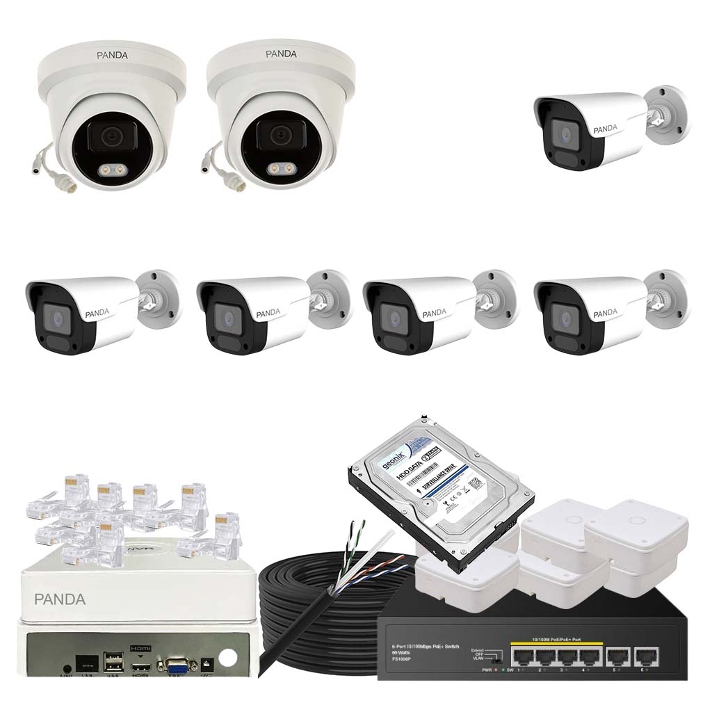 Panda Blue Series IP CCTV kit with 2 dome and 5 bullet 4MP IP cameras featuring color night vision and built-in audio. Includes 8-channel NVR, 4 PoE + 2 Uplink PoE configuration and 500GB HDD.