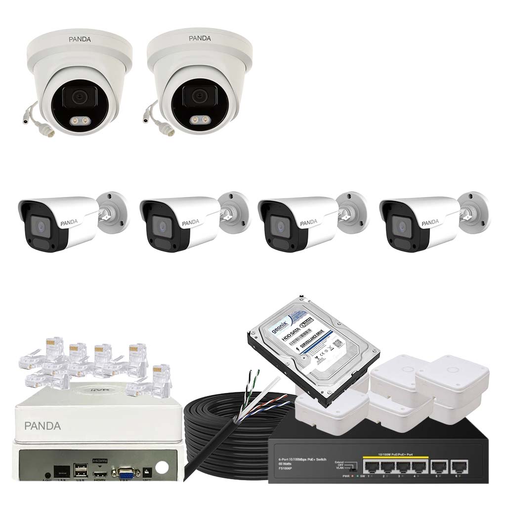 Panda Blue Series IP CCTV kit with 3 dome and 3 bullet 4MP IP cameras featuring color night vision and built-in audio. Includes 8-channel NVR, 8 PoE + 2 Uplink PoE configuration and 500GB HDD.