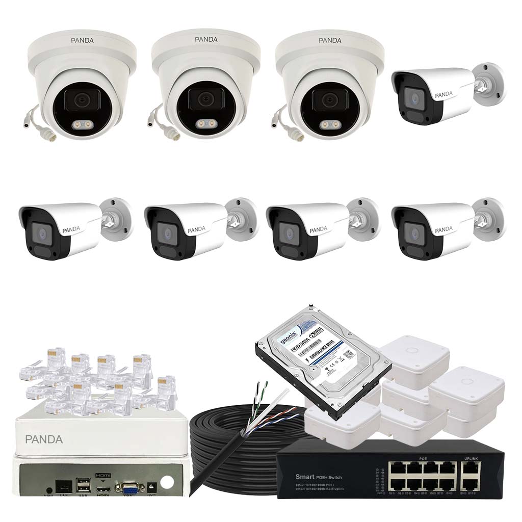 Panda Blue Series IP CCTV kit with 3 dome and 5 bullet 4MP IP cameras featuring color night vision and built-in audio. Includes 8-channel NVR, 8 PoE + 2 Uplink PoE configuration and 1TB HDD.
