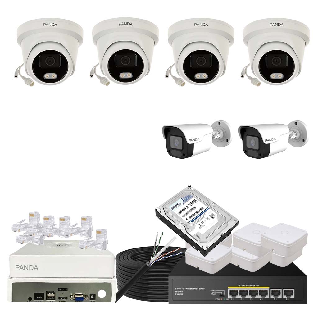 Panda Blue Series IP CCTV kit with 4 dome and 2 bullet 4MP IP cameras featuring color night vision and built-in audio. Includes 8-channel NVR, 4 PoE + 2 Uplink PoE configuration and 500GB HDD.