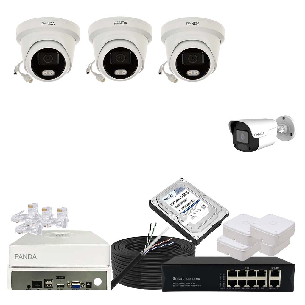 Panda Blue Series IP CCTV kit with 4 dome and 0 bullet 4MP IP cameras featuring color night vision and built-in audio. Includes 8-channel NVR, 8 PoE + 2 Uplink PoE configuration and 1TB HDD.