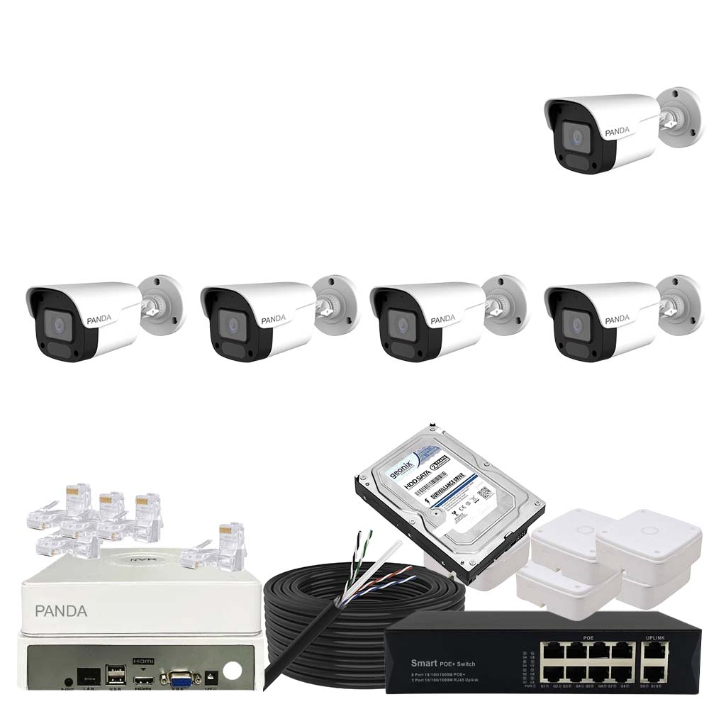Panda Blue Series IP CCTV kit with 0 dome and 5 bullet 4MP IP cameras featuring color night vision and built-in audio. Includes 8-channel NVR, 8 PoE + 2 Uplink PoE configuration and 500GB HDD.
