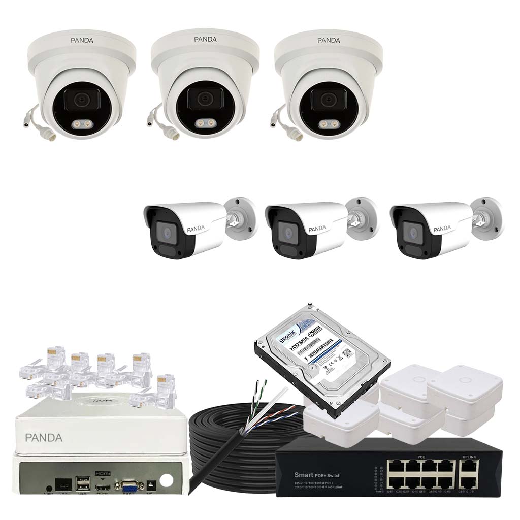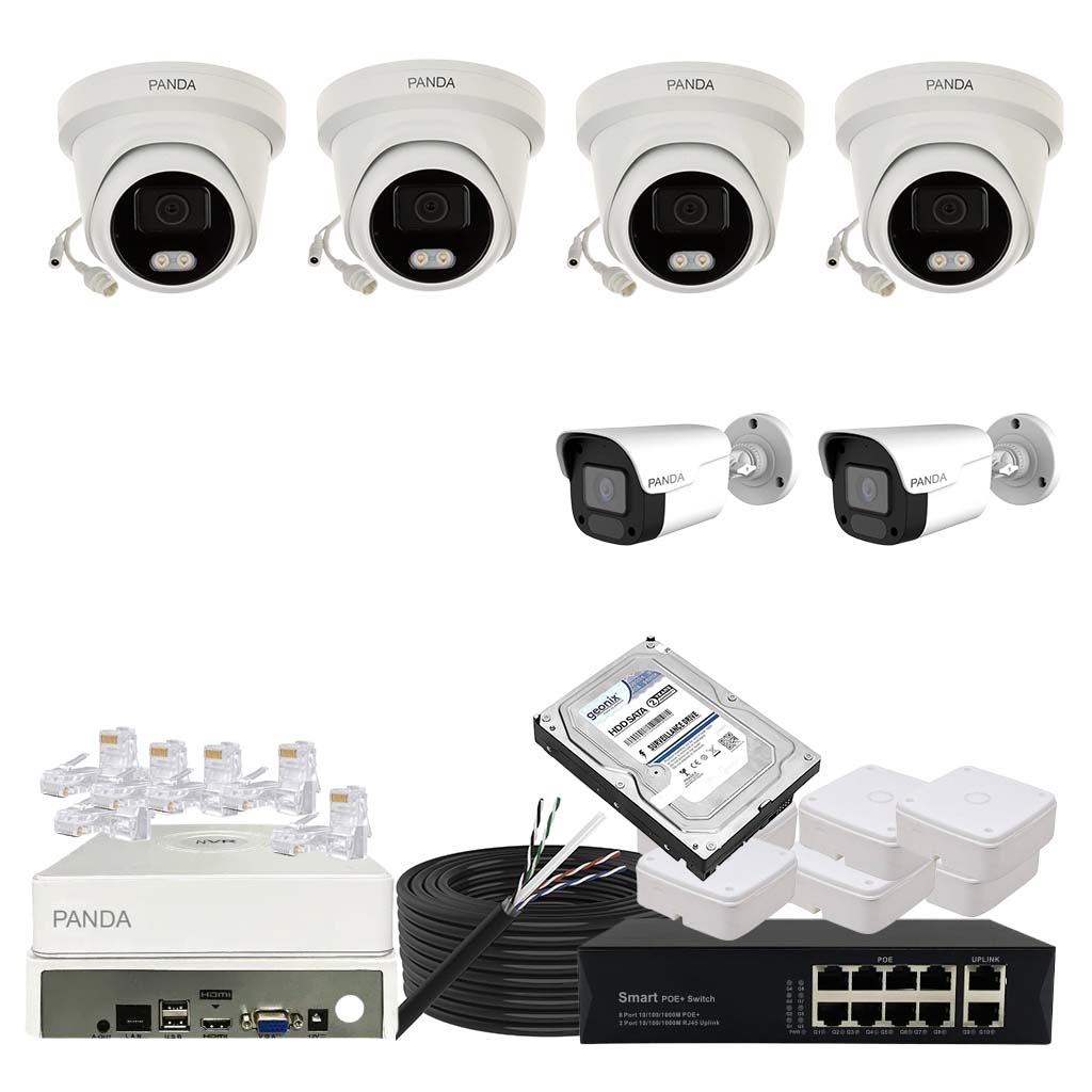 Panda Blue Series IP CCTV kit with 5 dome and 1 bullet 4MP IP cameras featuring color night vision and built-in audio. Includes 8-channel NVR, 4 PoE + 2 Uplink PoE configuration and 500GB HDD.