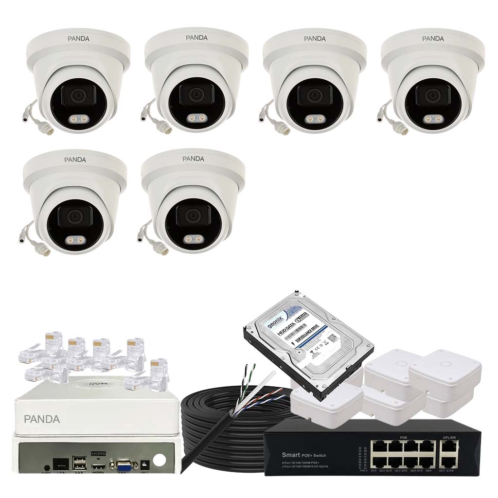 Panda Blue Series IP CCTV kit with 5 dome and 1 bullet 4MP IP cameras featuring color night vision and built-in audio. Includes 8-channel NVR, 8 PoE + 2 Uplink PoE configuration and 1TB HDD.