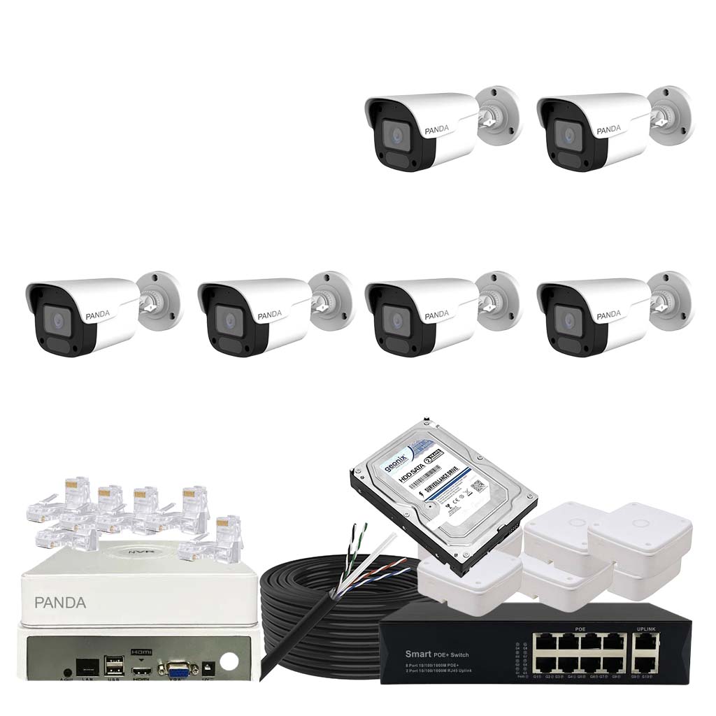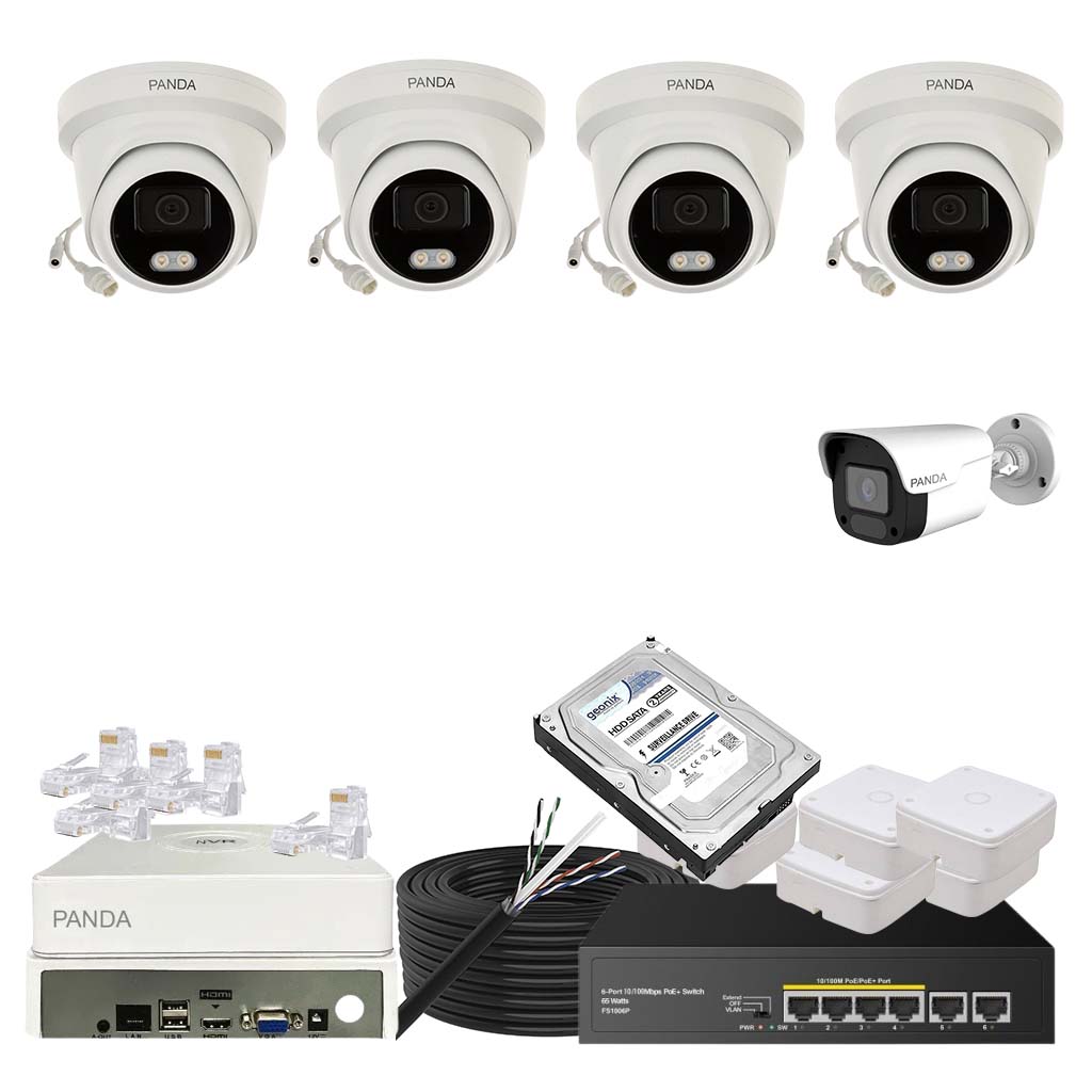 Panda Blue Series IP CCTV kit with 5 dome and 0 bullet 4MP IP cameras featuring color night vision and built-in audio. Includes 8-channel NVR, 8 PoE + 2 Uplink PoE configuration and 1TB HDD.