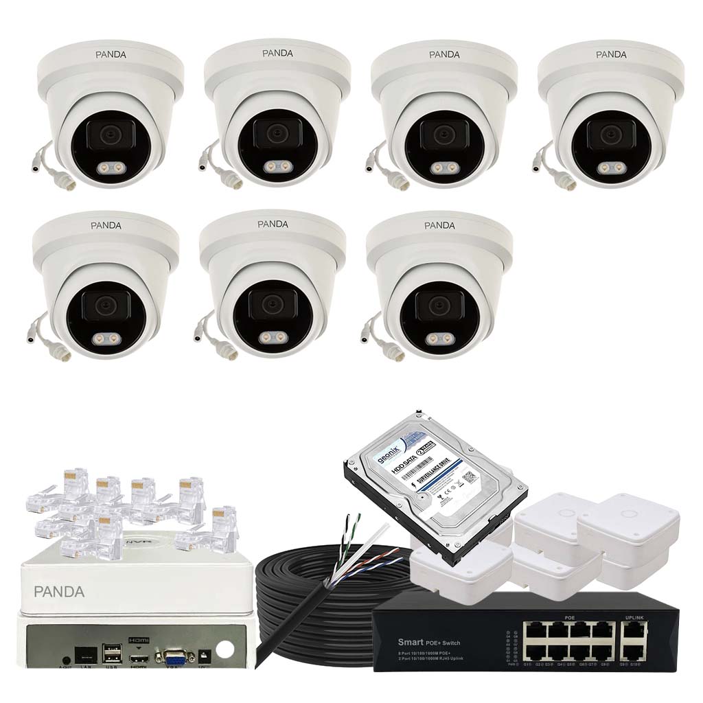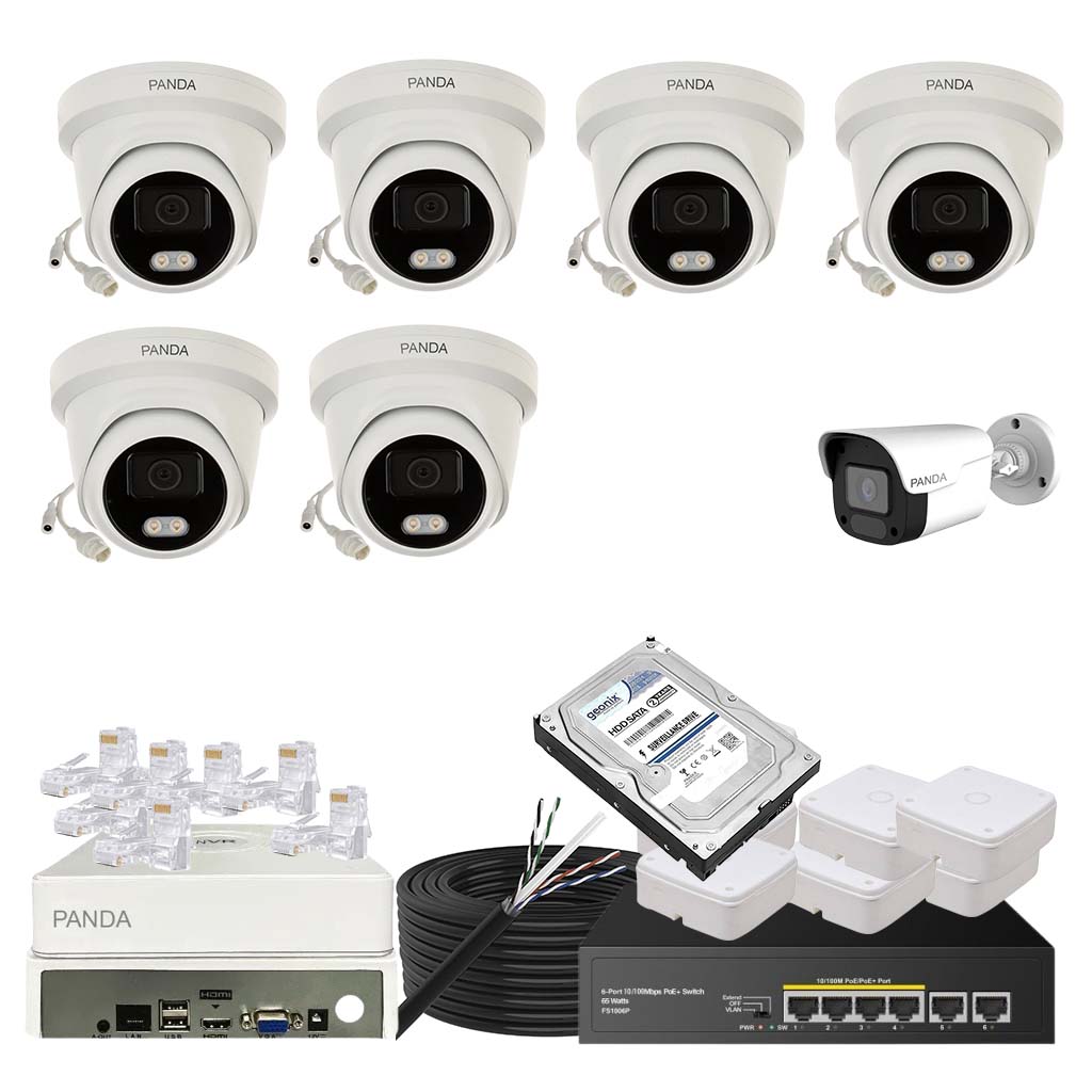Panda Blue Series IP CCTV kit with 6 dome and 1 bullet 4MP IP cameras featuring color night vision and built-in audio. Includes 8-channel NVR, 8 PoE + 2 Uplink PoE configuration and 1TB HDD.