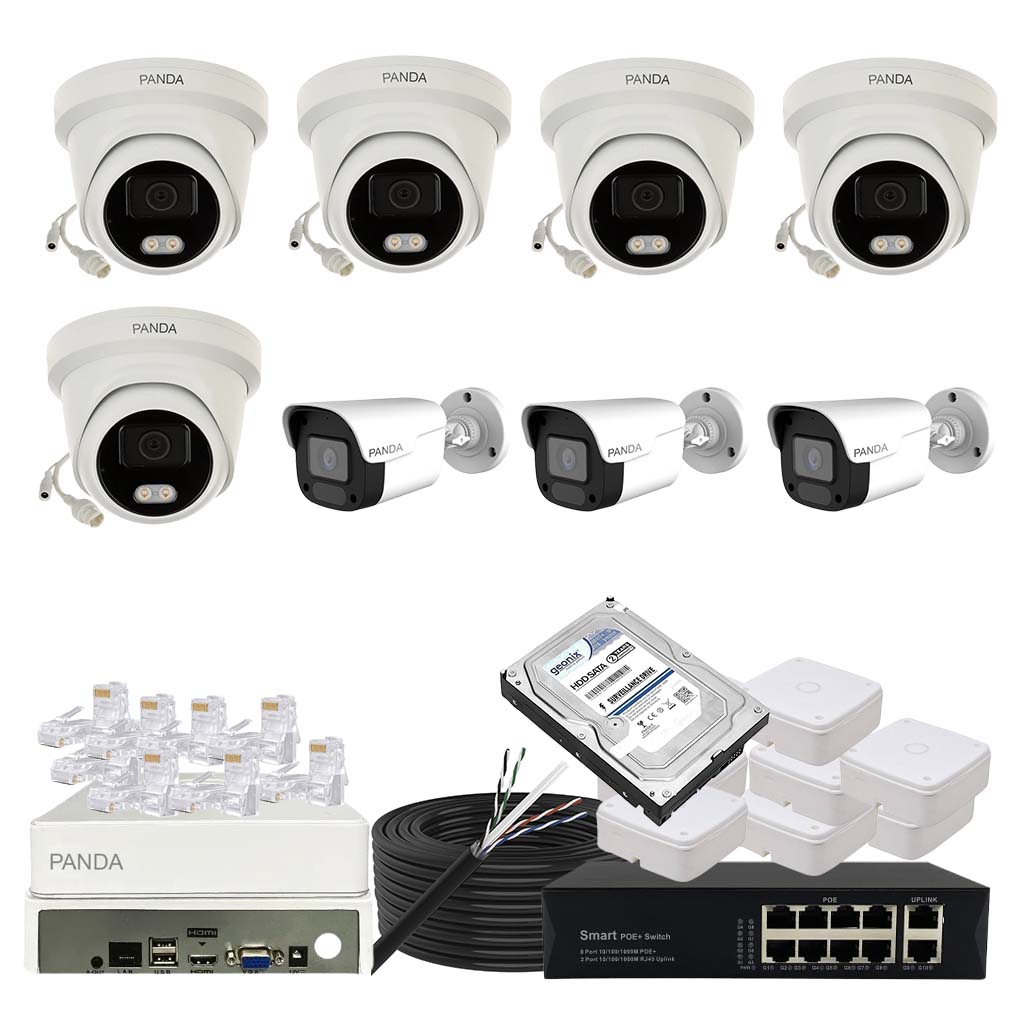 Panda Blue Series IP CCTV kit with 6 dome and 2 bullet 4MP IP cameras featuring color night vision and built-in audio. Includes 8-channel NVR, 4 PoE + 2 Uplink PoE configuration and 500GB HDD.