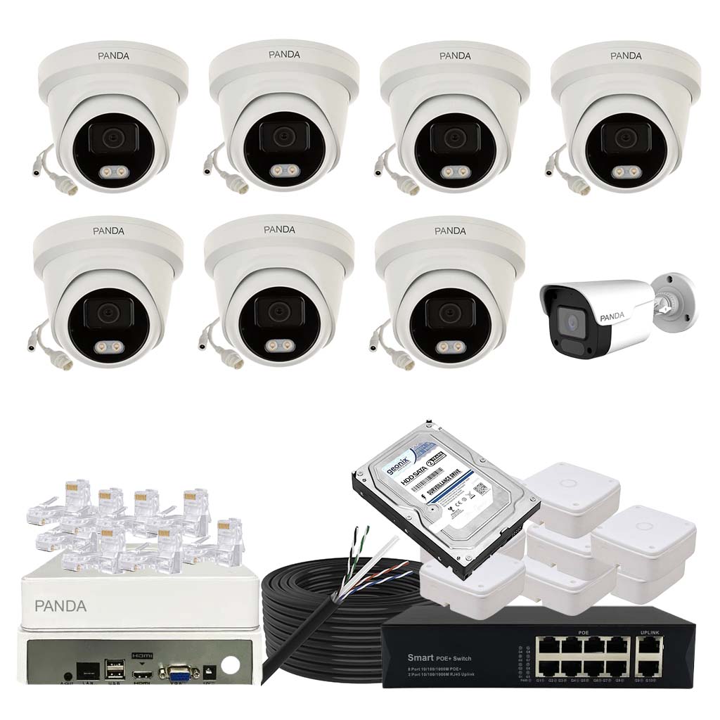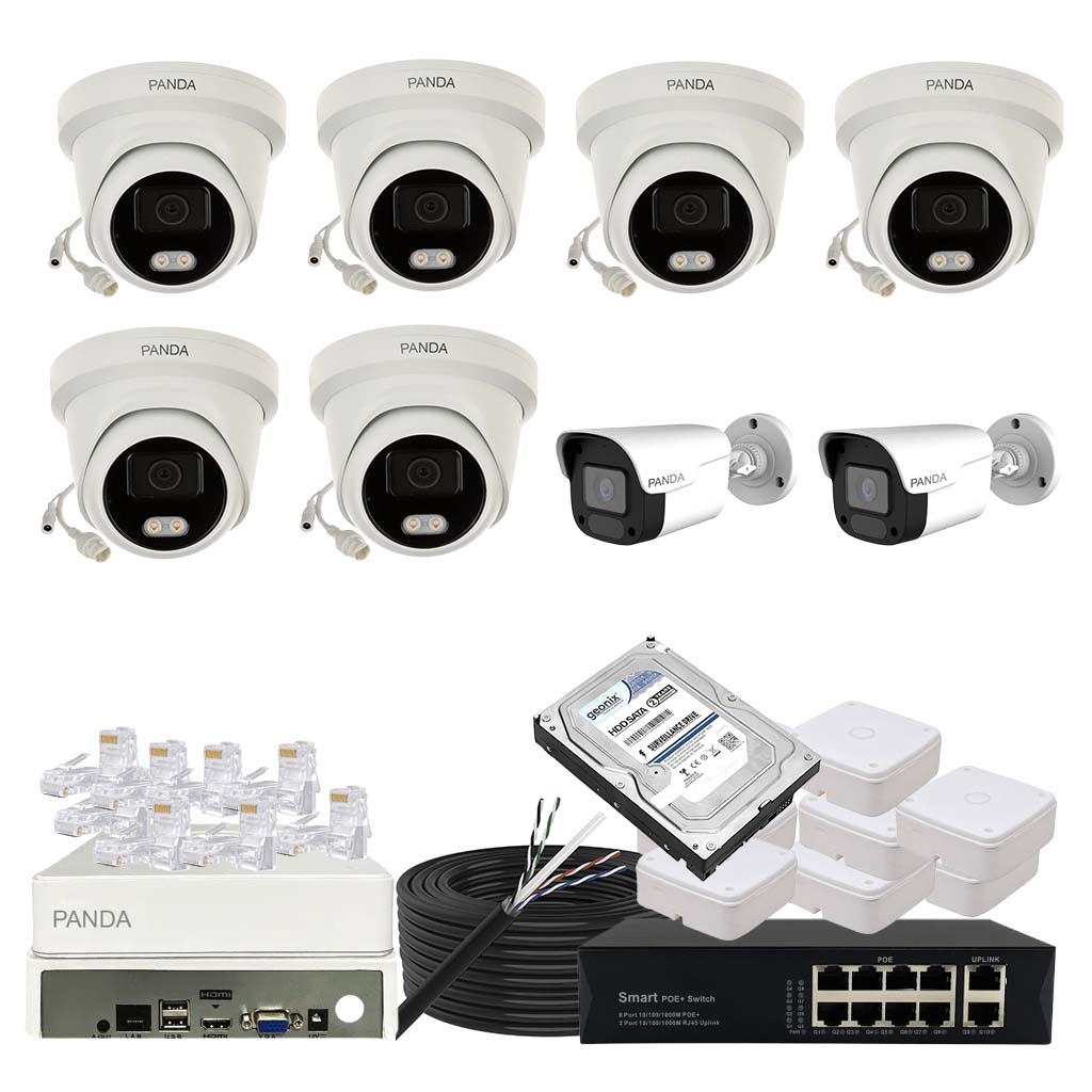 Panda Blue Series IP CCTV kit with 6 dome and 2 bullet 4MP IP cameras featuring color night vision and built-in audio. Includes 8-channel NVR, 8 PoE + 2 Uplink PoE configuration and 1TB HDD.