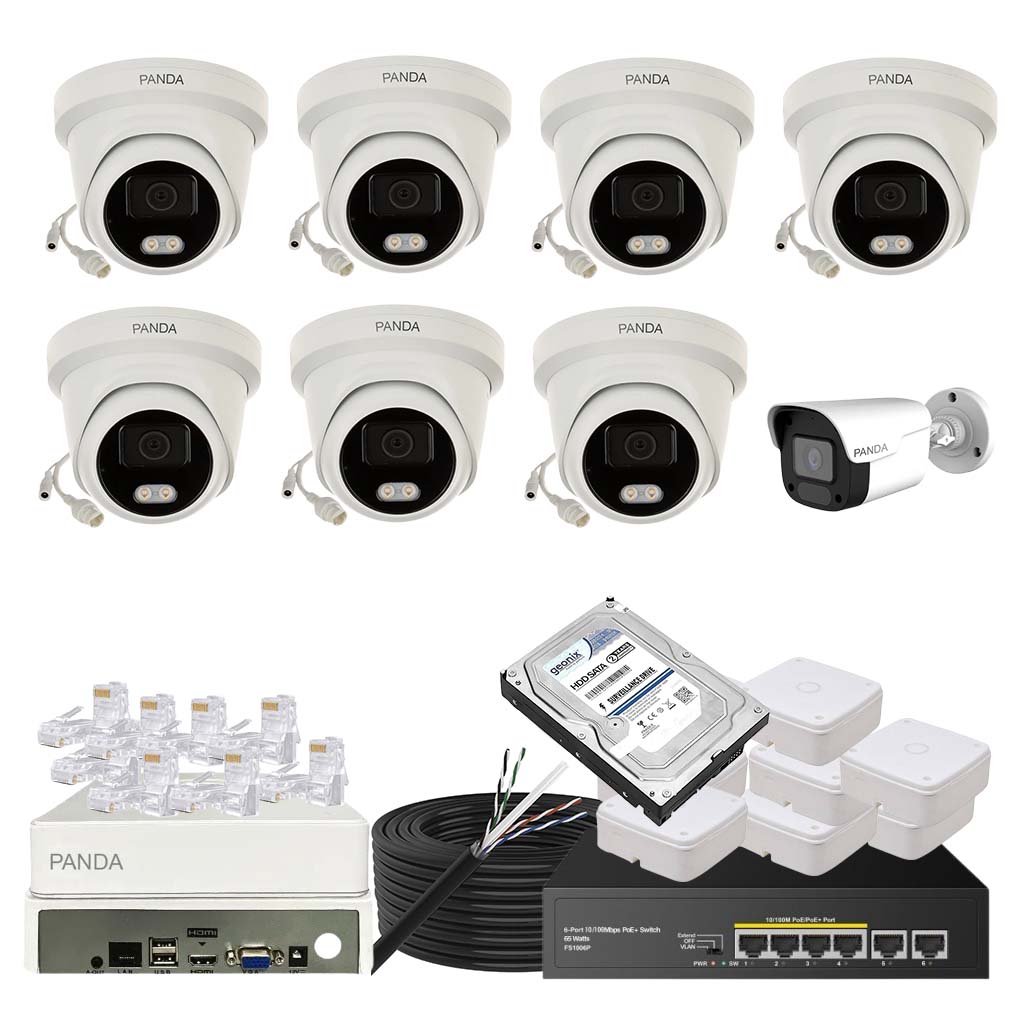 Panda Blue Series IP CCTV kit with 7 dome and 1 bullet 4MP IP cameras featuring color night vision and built-in audio. Includes 8-channel NVR, 4 PoE + 2 Uplink PoE configuration and 1TB HDD.