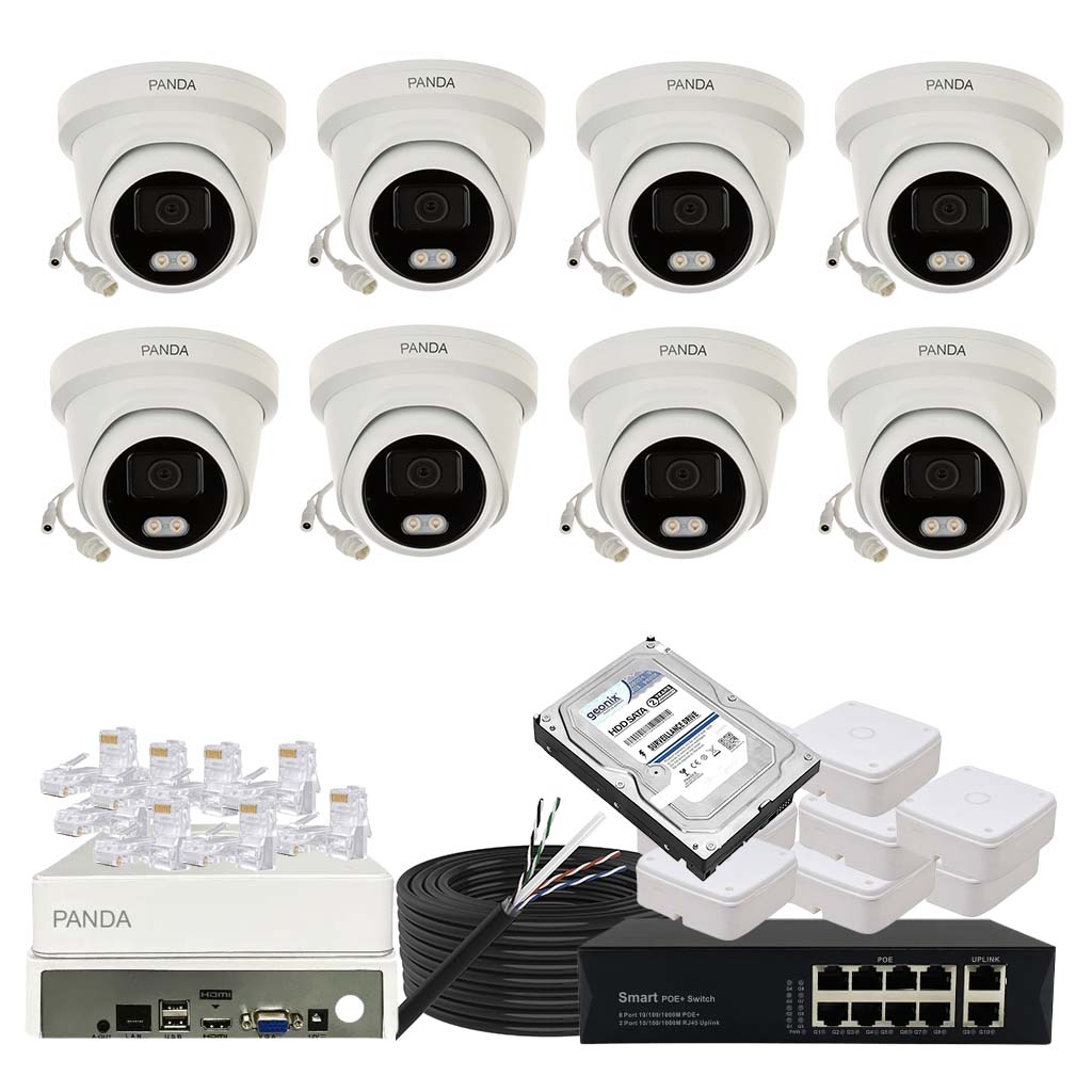 Panda Blue Series IP CCTV kit with 7 dome and 1 bullet 4MP IP cameras featuring color night vision and built-in audio. Includes 8-channel NVR, 8 PoE + 2 Uplink PoE configuration and 1TB HDD.